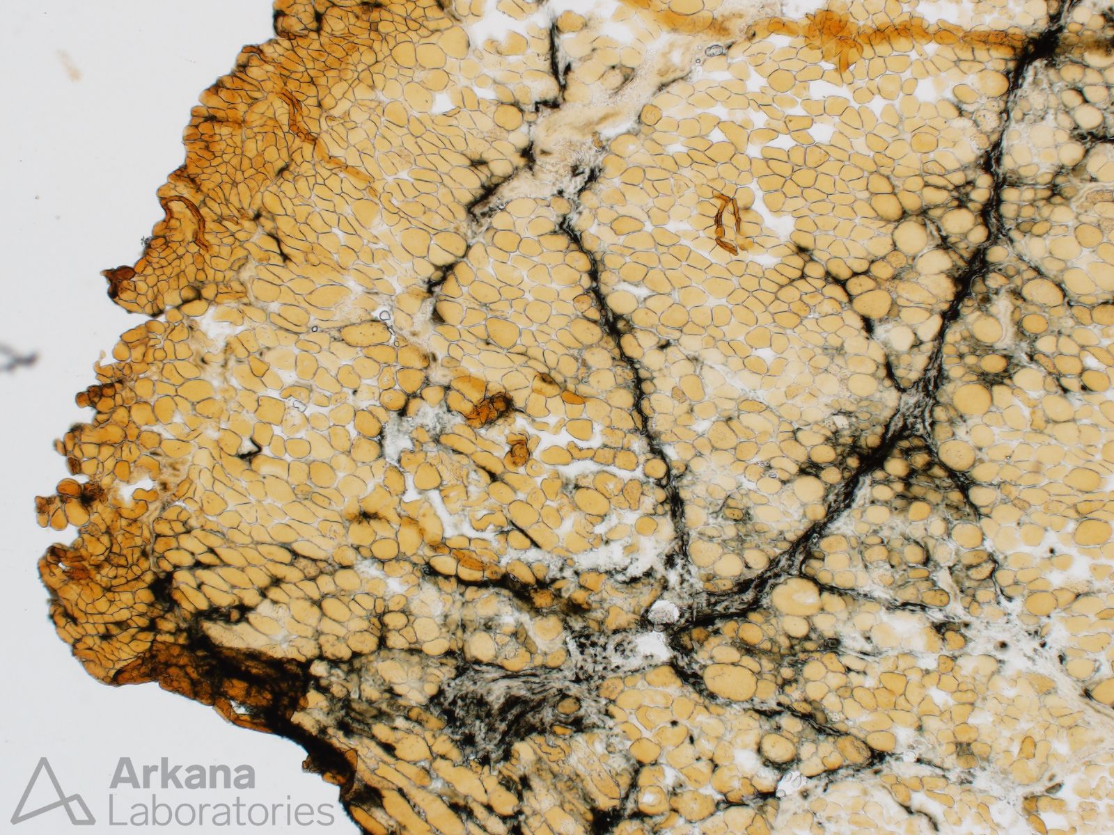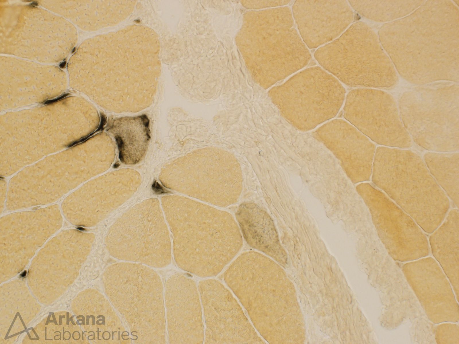 Alkaline phosphatase is useful for highlighting damaged myofibers, capillaries and perimysium. In this case, note that the damaged myofibers are present in a somewhat patchy distribution and show a predilection to be perifascicular in location. Also note the increase staining of perimysium and capillaries.