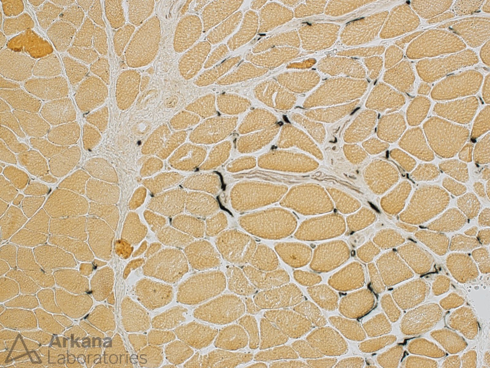 For comparison, Image #2 shows what the alkaline phosphatase stain looks like on normal skeletal muscle; Image #3 shows a higher power view of capillary and myofiber staining by alkaline phosphatase in an active myopathy; and Image #4 shows mild increase in capillary staining which is a common normal finding in areas of muscle biopsy containing intramuscular nerve twigs.