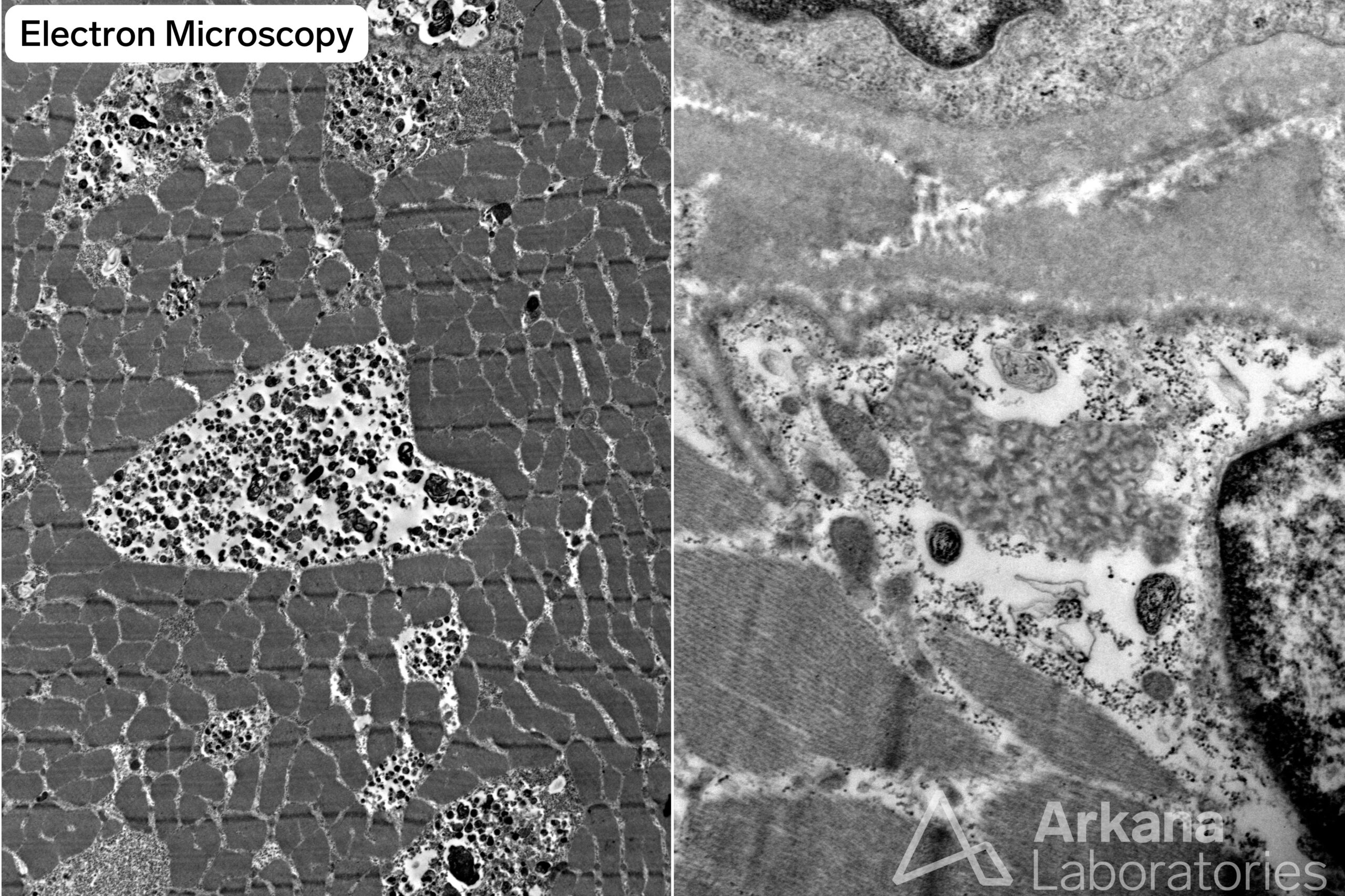 - Electron microscopy confirms the presence of frequent lysosomes within myofibers. In this case a single curvilinear body was identified.