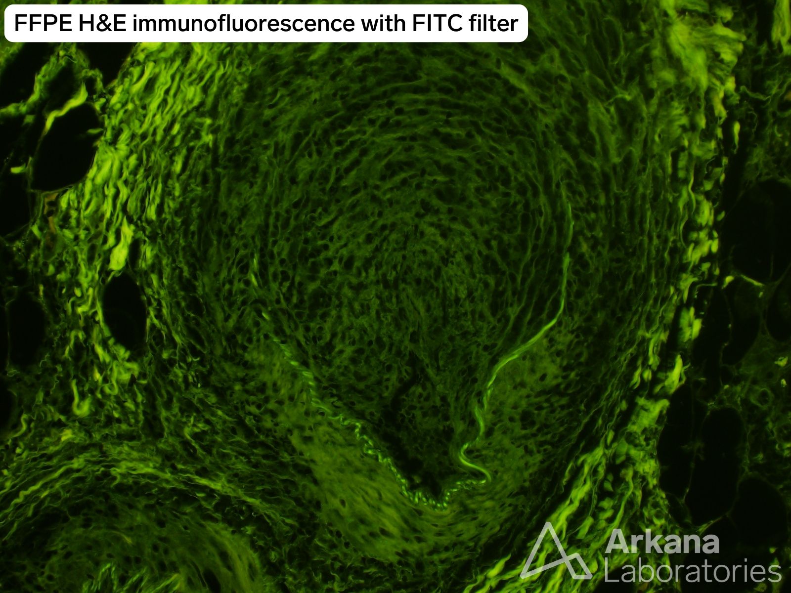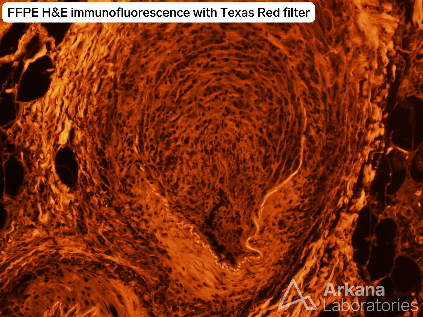 Eosin, present in the H&E stain (hematoxylin-eosin), is autofluorescent. Because the elastic lamina in arteries has an enhanced affinity for eosin it may be visualized on fluorescence microscopy on an H&E-stained section. In some instances it can serve as an alternative to an elastin stain.