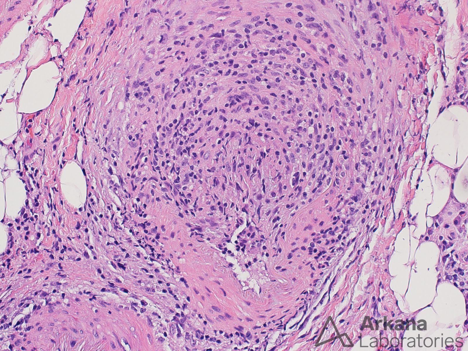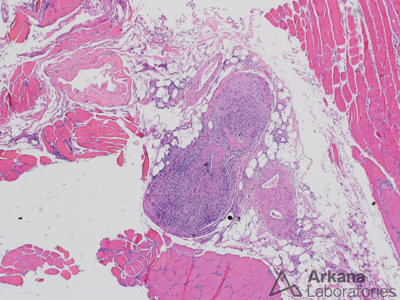 The H&E stain images demonstrate two blood vessels surrounded by chronic inflammatory cells and macrophages that also infiltrate the blood vessel walls, and areas of fibrinoid necrosis. The overall morphologic abnormalities are consistent with the presence of a small vessel vasculitis. In the context of this patient’s clinical history, vasculitis may be seen in the setting of Rheumatoid arthritis (rheumatoid vasculitis) and may also rarely be induced by leflunomide (i.e. drug induced vasculitis).